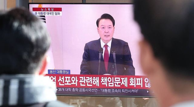 윤석열 대통령에 대한 국회의 탄핵소추안 발의일인 지난 12일 서울 중구 서울역 대합실에서 시민들이 윤석열 대통령의 4번째 대국민 담화를 시청하고 있다 / 뉴스1