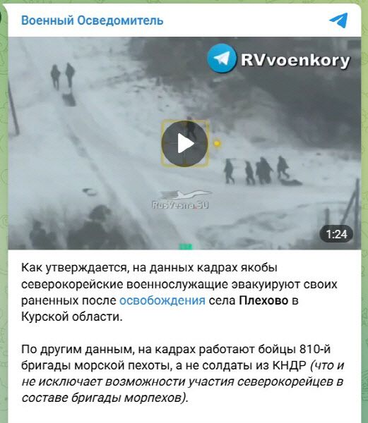 전쟁 소식을 다루는 다른 텔레그램 채널들도 비슷한 소식을 전하면서 세부 내용을 추가했다. 구독자가 24만3000명인 채널 ‘알렉스 파커 리턴스’는 플요호보 마을 점령의 모든 공을 북한군에게 돌리면서 북한군이 우크라이나 접경지역 수미에 ‘급습’을 감행했다고 했다.