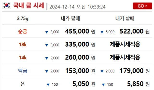 순금(24K) : 매입가 52만 2000원 / 매도가 45만 5000원