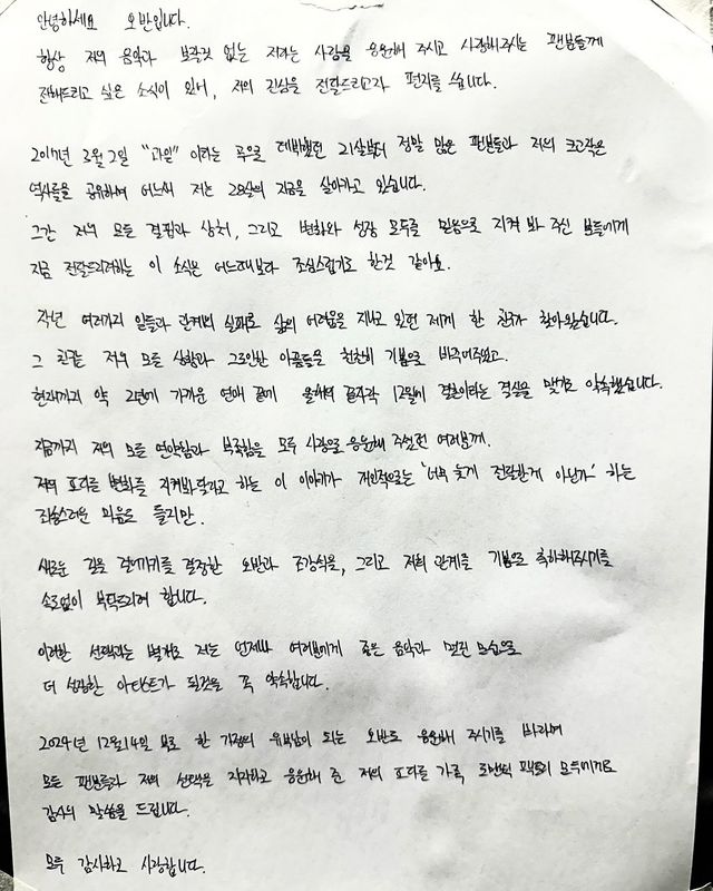 이어 "2024년 12월 14일 부로 한 가정의 유부남이 되는 오반도 응원해주시기를 바라며, 모든 팬분들과 저의 선택을 지지하고 응원해 준 저의 또 다른 가족 로맨틱 팬토리 모두에게도 감사말씀을 드립니다. 모두 감사하고 사랑합니다"라며 인사를 마무리 지었다.