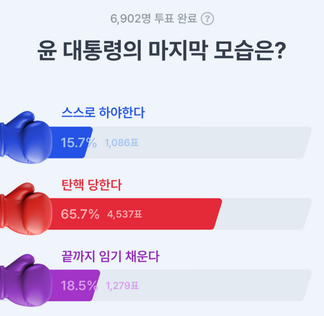 구체적으로 살펴보면 탄핵 당한다는 의견이 65%로 가장 많았고, 즉각 하야를 요구하는 목소리도 16%에 달했다. 반면 임기 완료를 지지하는 의견은 19%였다.