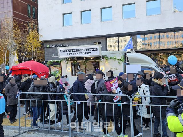 추운 날씨에서 긴 시간 집회 현장을 지켜야 하는 시민들은 물품을 나누며 온정을 보이기도 했다. 추위 속 따뜻한 음료와 간식, 핫팩을 제공하는 시민들부터 아예 커피차를 대절해 시민들에게 음료를 나눠주기까지 했다. 집회 인근 건물들은 모두 개방해 시민들에게 화장실 공간을 내어주기도 했다. 커피와 초코과자를 나눠주던 정학배(51)씨는 “지난주 나와보니 젊은 친구들이 벌벌 떨면서 있길래 따뜻함을 나눠주기 위해 이렇게 음료를 준비했다”고 웃음을 보였다.