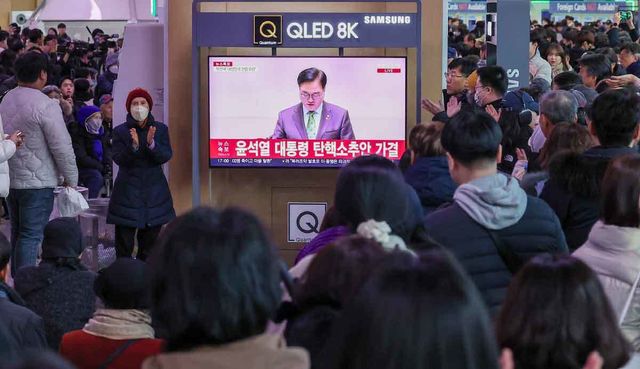 14일 서울 용산구 서울역 대합실에서 시민들이 윤석열 대통령에 대한 국회의 탄핵소추안이 가결되자 기뻐하고 있다. 이날 국회 본회의에선 재적의원 300명 전원이 투표에 참석, 이 중 204명 의원의 찬성으로 윤 대통령에 대한 탄핵소추안을 가결했다. 반대는 85명, 기권은 3표, 무효는 8표였다. / 뉴스1
