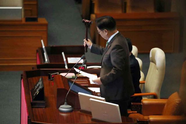 우원식 국회의장이 14일 오후 서울 여의도 국회에서 열린 제419회국회(임시회) 제4차 본회의에서 윤석열 대통령 탄핵소추안 가결을 알리고 있다. / 뉴스1