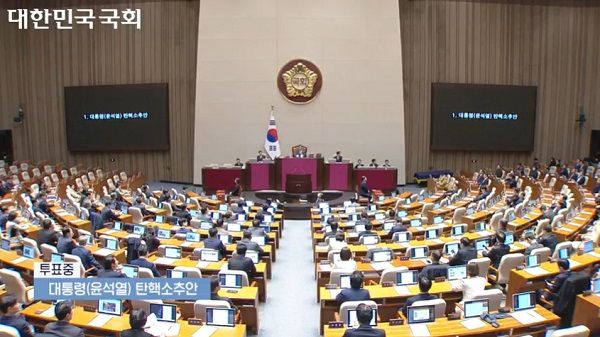 | 국회가 14일 오후 본회의를 열고 윤석열 대통령에 대한 탄핵소추안 표결을 진행하고 있다. [사진=국회 의사중계시스템] |