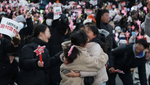 우원식 국회의장이 윤 대통령에 대한 탄핵소추안 가결을 선포하자 국회 앞은 환호성으로 터져나가는 듯했다. 시민들은 환호성을 내지르고 두 손을 하늘 위로 번쩍 들며 제자리에서 점프를 하는 등 기뻐하는 모습이었다. 옆 사람과 포옹을 하고 하이파이브를 하며 기쁨을 주체하지 못하기도 했다. 일부 시민들은 “우리가 이겼다”며 눈물을 흘렸다. 스피커에서 ‘다시 만난 세계’가 흘러나오자 시민들은 함께 노래를 부르며 탄핵안 가결의 즐거움을 만끽했다. 이들은 “우리가 이겼다”, “윤석열을 체포해라”고 외치기도 했다.