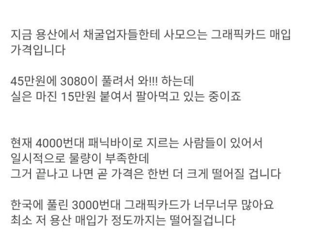 현직 용팔이 피셜 채굴 중고 3070은 23만원까지 떨어질거다