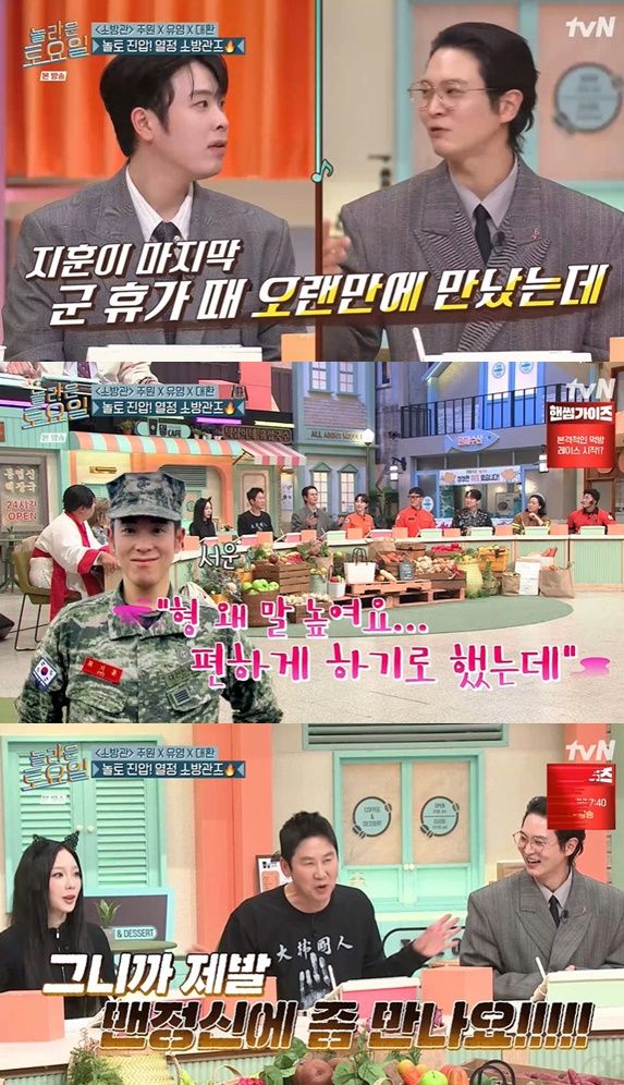 주원은 "지훈이랑 말을 놓고 지냈다. 마지막 군 휴가 나왔을 때 만났는데 (말을 놨었는지) 긴가민가했다. 그래서 '지훈 씨 잘 지냈어요?' 뭐 이렇게 인사했다"며 오랜만에 만난 피오에게 거리감이 느껴지는 호칭을 사용한 것에 대해 사과의 뜻을 전했다.