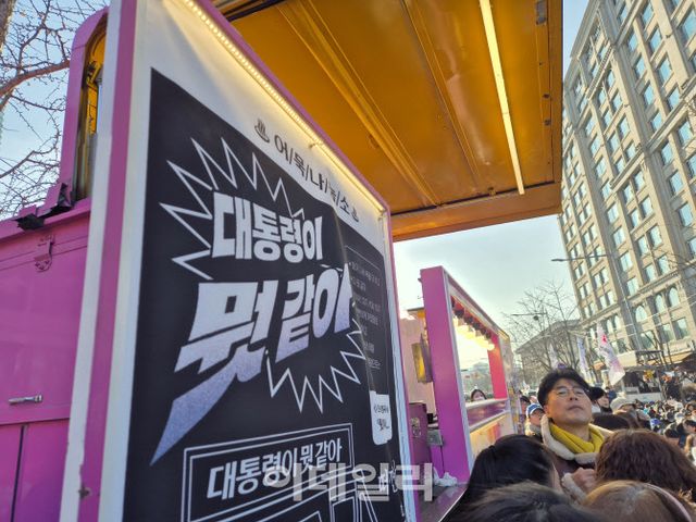 14일 오후 1시 서울 여의도 국회 앞 한 거리에는 가격표 없는 푸드트럭 10여 대가 양쪽으로 줄지어 서있었다. ‘어묵나눔소’ ‘윤석열을 체포하라’ 등이 적힌 트럭에서는 무료로 어묵과 츄러스, 닭강정 등을 나눠주고 있었다. 영하권 날씨 속 시민들은 트럭 옆 한 켠에서 뜨거운 어묵 국물을 마시며 몸을 녹였다. 대학생 허민영(24)씨는 “춥고 배고팠는데 음식을 무료나눔하는 트럭이 많아서 놀랐다”며 “대통령 탄핵을 모두가 같은 마음으로 바라고 있구나 싶다”고 말했다.