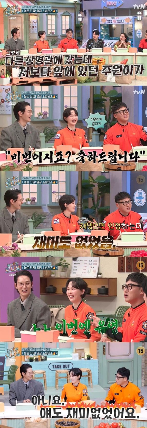 이어 그는 "소방관들이 3교대를 한다. 초청받은 분들은 비번이기 때문에 오신 거다"고 설명하더니 "제 차례가 왔을 때 '소방관님들 진심으로 존경하고 사랑한다. 그리고 축하드립니다. 비번이라 오신 거잖아요' 하니까 재밌어 하셨다"고 분위기 전환에 성공하자 다음 무대 인사부터 이 멘트를 사용하리라 다짐했다고 덧붙였다.