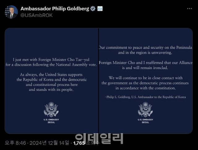 골드버그 대사는 이날 사회관계망(SNS) X(옛 트위터)에 올린 글에서 “조금 전 조태열 외교부 장관을 만나 국회 표결 이후의 상황에 대해 논의했다”며 이같이 전했다.