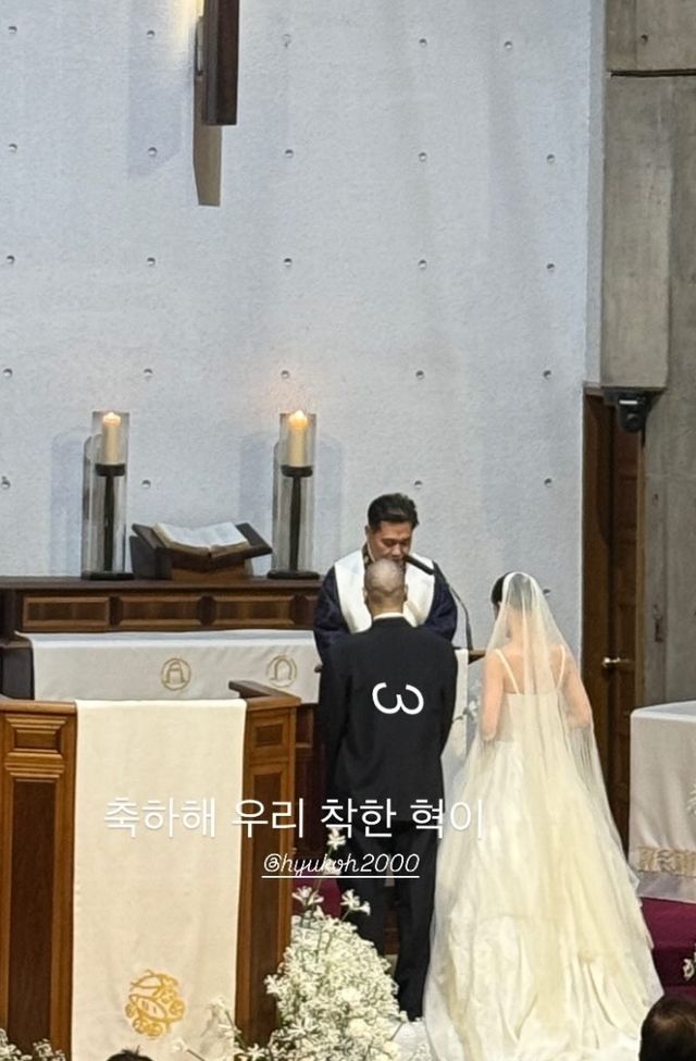 사진에는 오혁의 결혼식 현장이 담겨있다. 하객으로 참석한 코드 쿤스트는 절친한 연예계 동료인 오혁의 결혼을 축하하며 축복하고 있다.