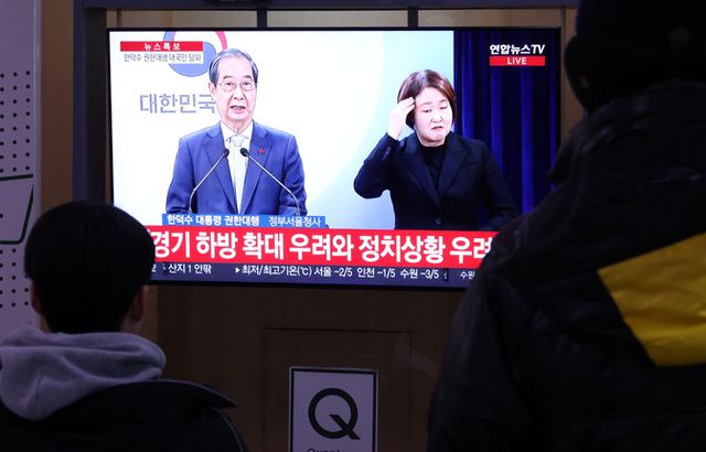 14일 오후 서울역에서 시민들이 한덕수 대통령 권한대행 겸 국무총리의 대국민담화 발표를 TV를 통해 지켜보고 있다. ⓒ 연합뉴스