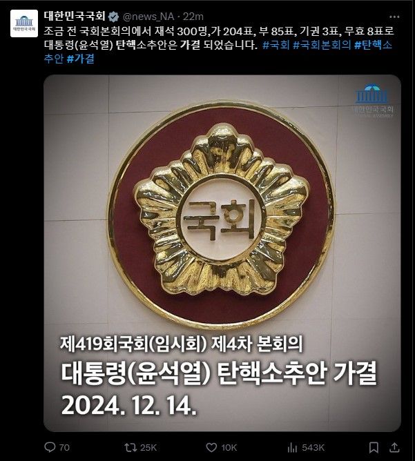 엑스의 '대한민국국회' 계정은 14일 오후 5시 3분 "조금 전 국회 본회의에서 재석 300명, 가 204표, 부 85표, 기권 3표, 무효 8표로 대통령(윤석열) 탄핵소추안은 가결되었습니다"라고 알렸다. 이에 "아싸", "만쉐이(만세)"라는 즉각적인 반응뿐만 아니라 "뿌듯하다", "마침내 좋은 소식을 들었습니다, "감사합니다. 오늘 밤은 드디어 두 다리 뻗고 자겠습니다" 등 반응도 줄을 이었다.