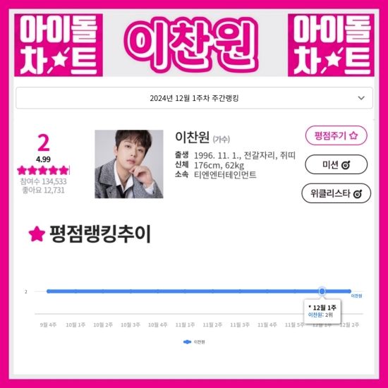 아이돌차트는 최근 이찬원이 12월 1주 차 평점 랭킹에서 134,533표를 받아 2위를 차지했다고 밝혔다.