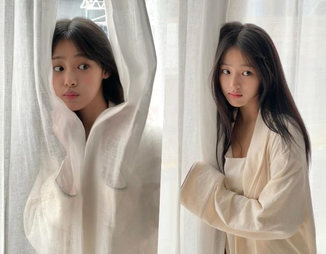 사진 속 민지는 하늘거리는 화이트 커튼 앞에서 가운을 입고 자연스러운 미모로 시선을 사로잡는다. 또한 포토월에 서기 전 메이크업을 마친 모습 등을 공개하며 좀 더 친숙하게 대중에게 다가선 모습이다.