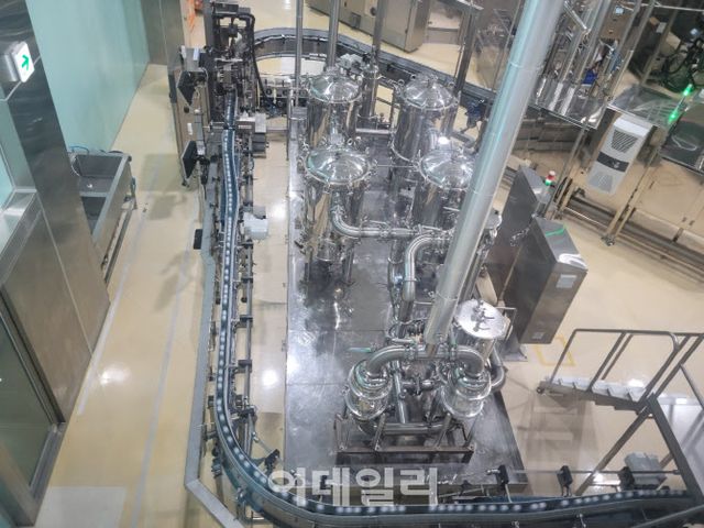 이날 핵심 기술인 용암해수에서 칼슘과 마그네슘을 분리하는 과정을 자세히 볼 수는 없었다. 커다란 은색의 가마솥 안에서 빚어지는 과정인 데다 오리온만의 영업 비밀이기에 솥과 복잡하게 연결된 외부 관만이 눈에 들어왔다. 오리온은 대신 고온의 열과 압력으로 제품을 담을 페트병을 만들고 여기에 라벨을 붙여 알칼리수를 병입한 뒤 포장하는 과정은 투명하게 공개했다.