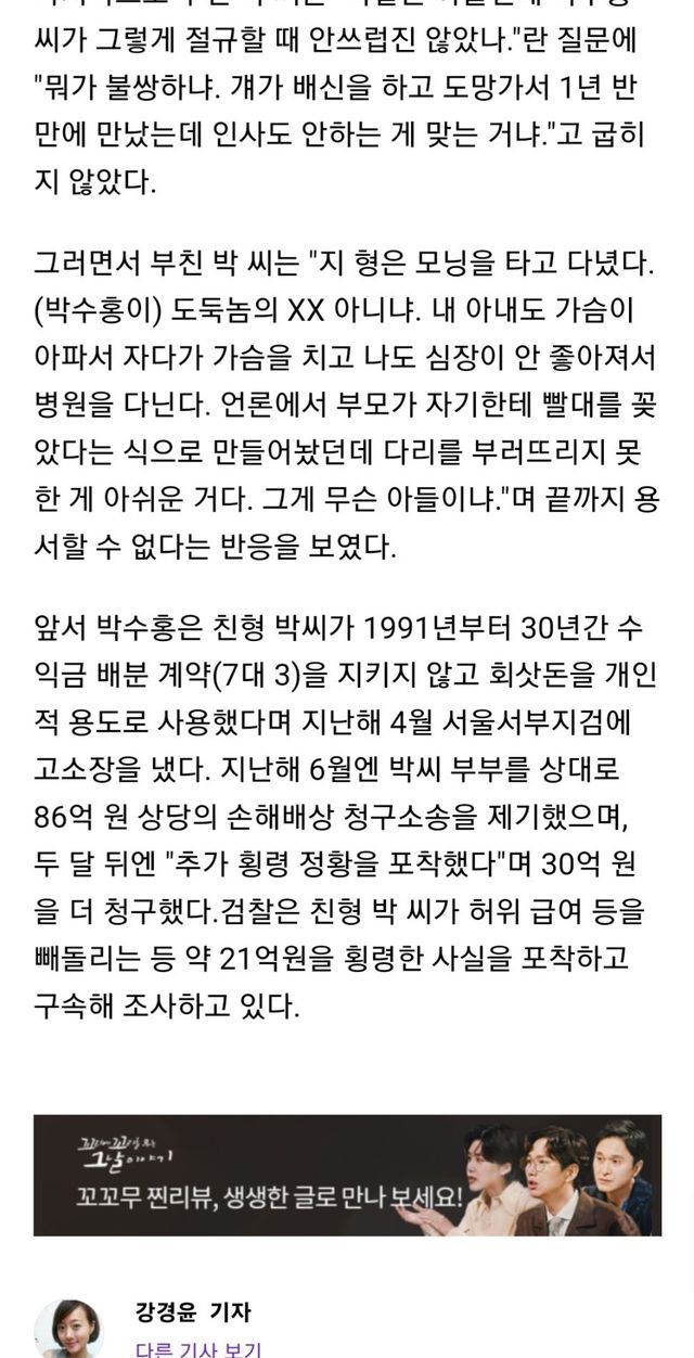 [단독 인터뷰] 박수홍 부친 “부모 형제를 도둑 취급.