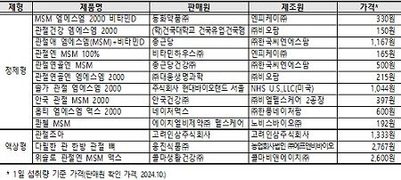 정제형은 `관절건강 엠에스엠 2000((학)건국대학교 건국유업·건국햄)'이 150원으로 가장 저렴했고, `관절애 엠에스엠(MSM)+비타민D(종근당)'가 1,167원으로 가장 비쌌다.