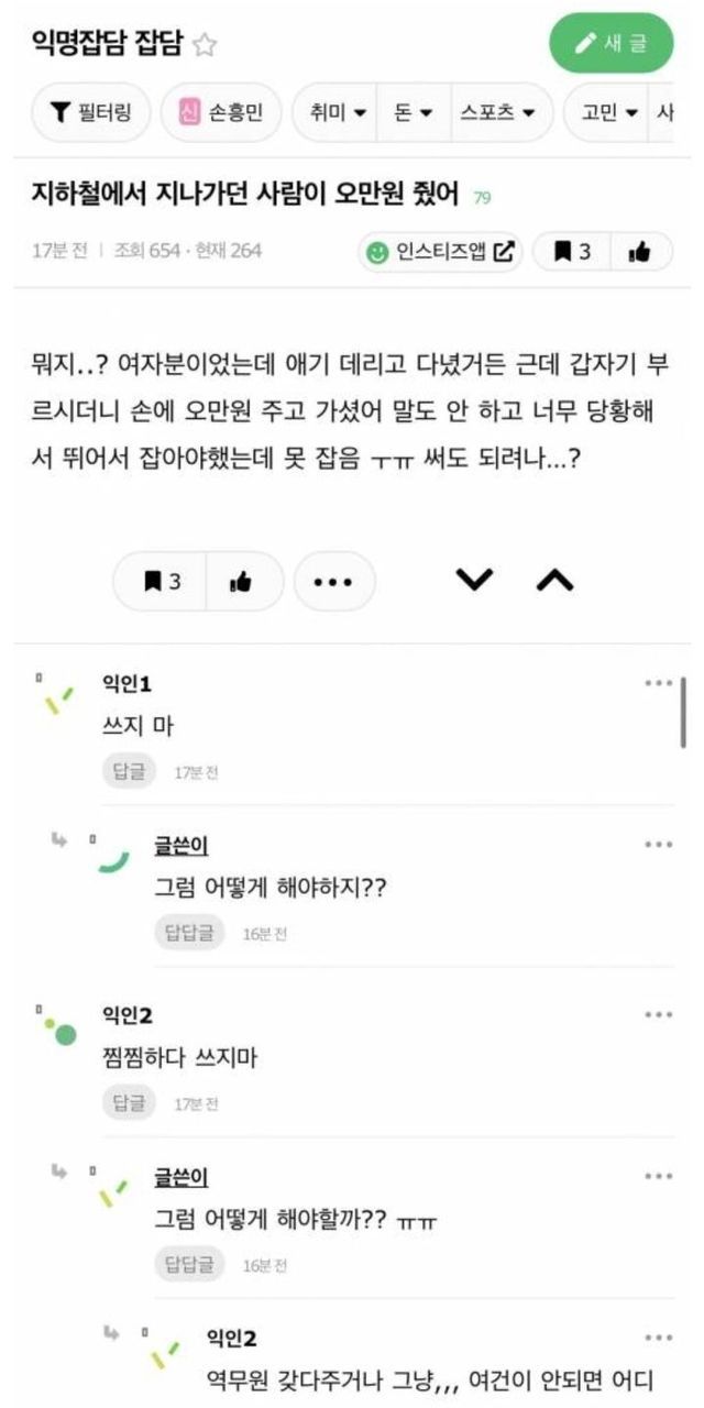지하철에서 모르는 사람이 돈줌.