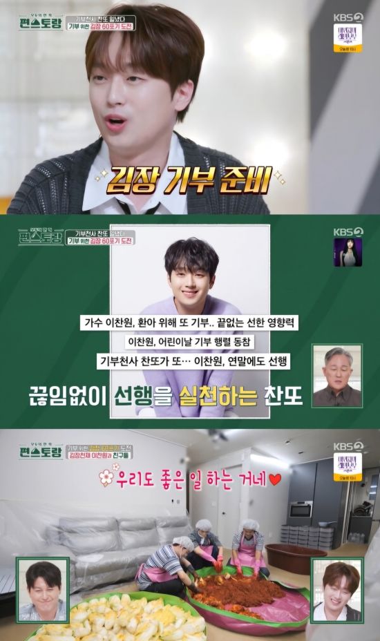 이찬원은 지난 12월 6일 '편스토랑'에서 절친 황윤성, 김중연과 함께 독거노인들에게 기부할 김장을 준비했다.