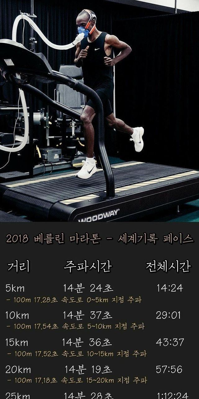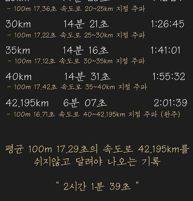 킵초게는 1km당 최저 2분 36초 ~ 최대 2분 57초 사이로
