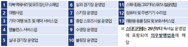’25년부터 새롭게 현금영수증 의무발행업종으로 추가되는 13개 업종은 의복 액세서리 및 모조 장신구 소매업, 여행사업, 기타 여행 보조 및 예약 서비스업, 앰뷸런스 서비스업, 실내 경기장 운영업, 실외 경기장 운영업, 스키장 운영업, 종합 스포츠시설 운영업, 수영장 운영업, 볼링장 운영업, 스쿼시장 등 그 외 기타 스포츠시설 운영업, 컴퓨터 및 주변기기 수리업, 애완용 동물 장묘 및 보호서비스업 등이다.