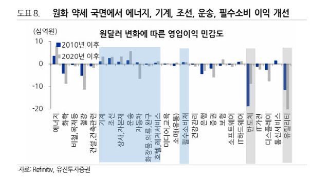 원·달러가 상승한 이후 영업이익이 좋아지는 업종은 에너지, 기계, 조선, 운송, 필수소비 업종 등이다. 반대로 반도체, 유틸리티 업종의 영업이익은 원달러가 하락할 때 빠르게 개선됐다.