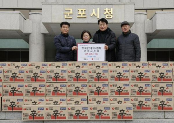 [한국미디어뉴스통신 박말희 기자] 군포시는 12일 한국공인중개사협회 군포시지회가 연말을 맞아 어려운 이웃을 돕기 위해 회원들의 자발적인 참여로 마련한 라면 65박스(200만원 상당)를 기탁했다고 밝혔다.