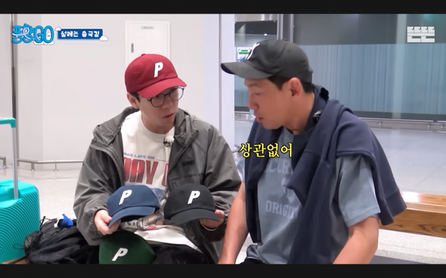 양세찬이 풍향고 1화에서 팀 모자로 준비한 이니셜 P 박힌 모자 네 개