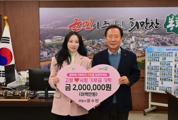 [한국미디어뉴스통신 박말희 기자] 봉화 출신의 윤수빈 변호사가 지난 13일 봉화군청을 방문해 고향사랑기부금 200만 원을 기탁했다.