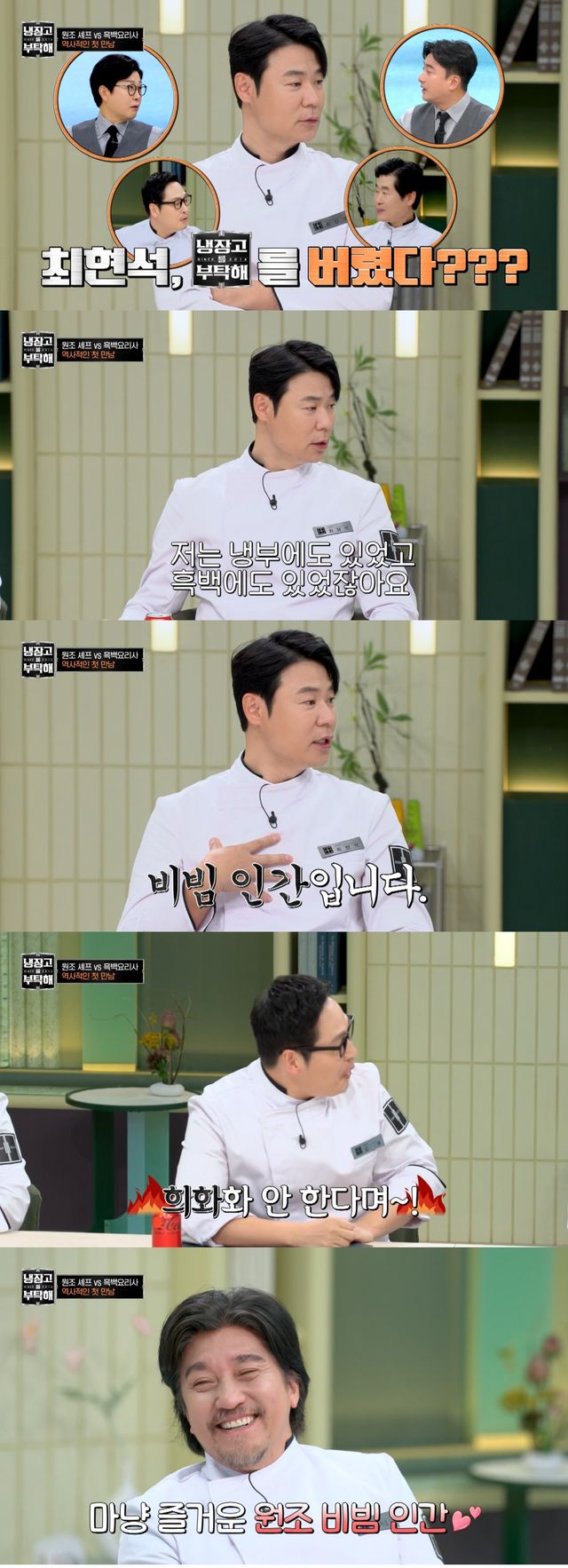 이에 최현석은 "전 '냉부해'도 있었고 흑백요리사도 있었다. 그래서 '저는 비빔인간 입니다'"라며 '흑백요리사' 에드워드 리의 성대모사를 해 웃음을 자아냈다.