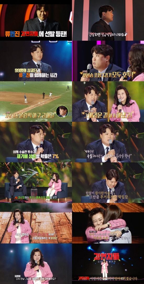방송 최초로 강연 무대에 오른 류현진은 긴장한 기색이 역력한 모습으로 땀에 흠뻑 젖은 채 강단에 섰다. 그는 ‘전지적 류현진 시점’이라는 코너를 통해 30년 가까운 야구 인생을 되돌아보며 관객과 시청자들에게 자신의 이야기를 들려줬다.