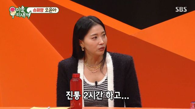 이에 서장훈은 “황금 골반 덕분에 아들도 1분 만에 출산했다더라”고 언급했고, 오윤아는 “골반이 보기에만 좋은 게 아니더라. 어렸을 때 무용을 해서, 고관절이 벌어질 때 산모들은 보통 아파하지만, 저는 자연적으로 벌어진 상태라서 진통을 많이 안 하고 애를 낳을 수 있다고 병원에서 미리 말씀을 해주셨다. (의사가) 장갑을 끼고 계실 때 제가 1분 만에 아이를 낳아서 힘주지 말라고 했다. 담당의가 못 오시고 대신 옆방 의사가 오셨다. 진통은 2시간 했다”라고 밝혔다. 어머니들은 입을 모아 “축복 받았다”고 놀라워했다.