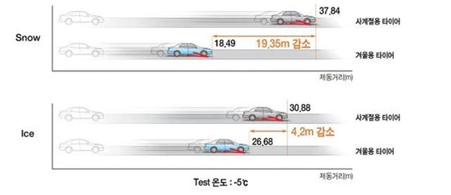 사계절용 타이어와 겨울용 타이어의 제동거리 비교 결과 / 출처=한국타이어