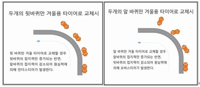 겨울용 타이어를 앞바퀴 두 개만 교체할 경우에도 앞바퀴 접지력은 올라가는 반면 뒷바퀴 접지력은 낮은 상태가 되므로, 코너링 시에 원심력에 의한 차선 이탈(오버스티어)이 발생할 가능성이 있습니다. 따라서 겨울용 타이어를 교체할 때는 네 바퀴 모두 교체해야 안전합니다.