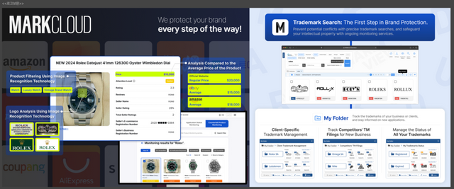 마크클라우드는 지식재산권 보호를 위한 AI 기반 솔루션을 제공하며, 상표 검색, 브랜드 네이밍, 위조 상품 모니터링에 이르는 다양한 서비스를 운영 중이다. 이 회사의 대표 서비스인 ‘마크뷰(MarkView)’는 문자와 이미지 기반 상표를 포괄적으로 검색하고, 유사 발음 및 문자를 정밀 분석해 전문가의 의사결정을 지원한다.