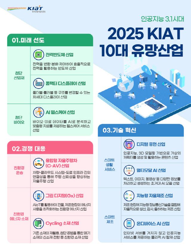 한국산업기술진흥원(KIAT)은 16일 ‘인공지능(AI)3.1’ 시대 대한민국 경제를 견인하고 산업기술 혁신을 도모할 10대 유망산업을 발표했다. KIAT가 선정한 10대 유망산업은 △전력 반도체 △폼팩터 디스플레이 △AI 헬스케어 △융합형 자율주행차 △그린 디지털 △순환 소재 △디지털 휴먼 △멀티모달 AI △지능형 자율제조 △온디바이스 AI다.