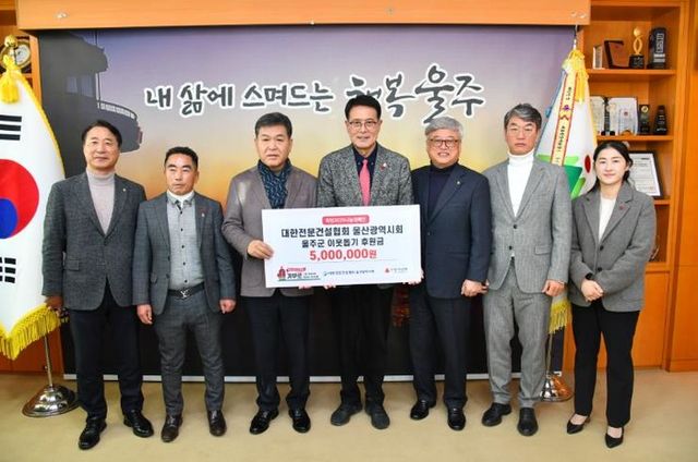 이순걸 군수는 “매년 울주군의 어려운 이웃을 위해 기부해주신 대한전문건설협회에 진심 어린 감사를 표한다”며 “따뜻한 마음을 담아 도움이 필요한 분들께 성금을 잘 전달하겠다”고 밝혔다.