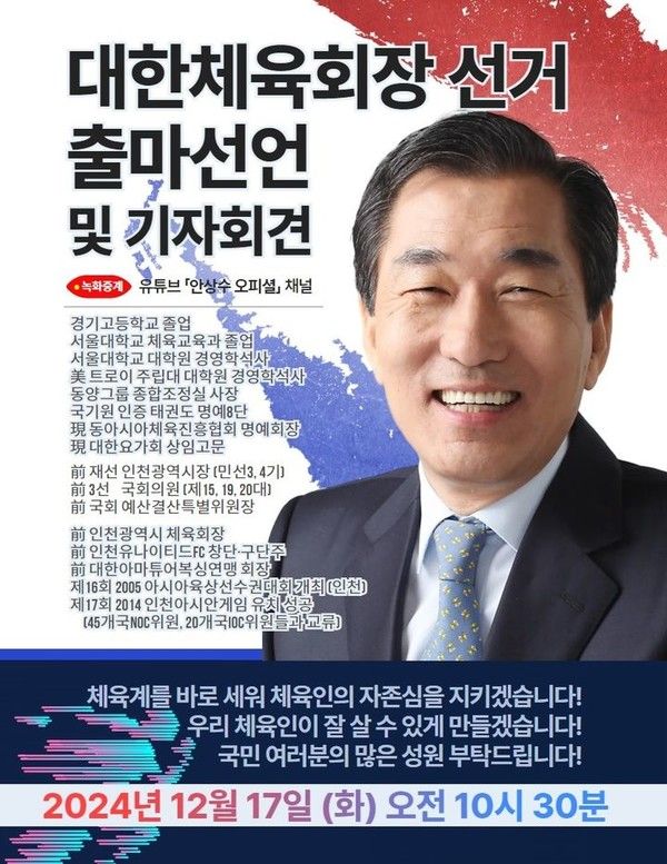 안 전 시장 측은 "17일 한국프레스센터에서 체육회장 선거 출마를 공식 선언하는 기자회견을 개최한다"고 16일 밝혔다.
