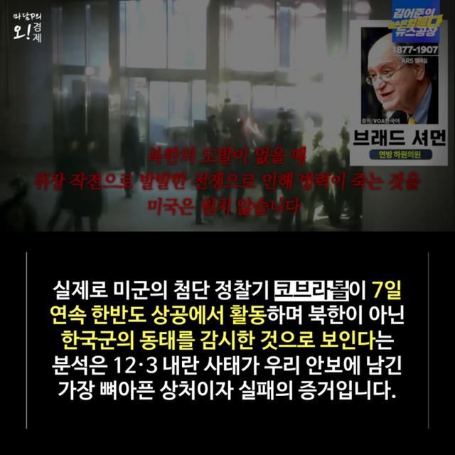 미국 역시 이를 면밀히 감시하고 있었다 것인데 특히 미 하원 브래드 셔먼 의원의 공개적인 발언은 이런 한국군의 움직임에 대한 경고로 읽히며, 윤석열 대통령의 불법 계엄 시도와 그 후유증이 국제적으로도 심각한 안보 불안 요인이 됐음을 보여준다.