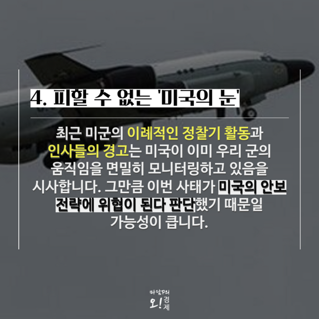 넷째, 미국이 한국 급변 사태에 대해 이미 정보력을 동원해 감시하고 있었다는 정황이 적지 않다. 최근 미국의 최첨단 정찰기의 이례적인 후방 활동과 여러 인사들의 경고는 미국이 이미 우리 군의 움직임을 면밀히 모니터링하고 있음을 시사한다. 이는 12·3 내란 사태가 미국의 안보 전략에 위협이 된다고 판단했기 때문일 가능성이 크다.