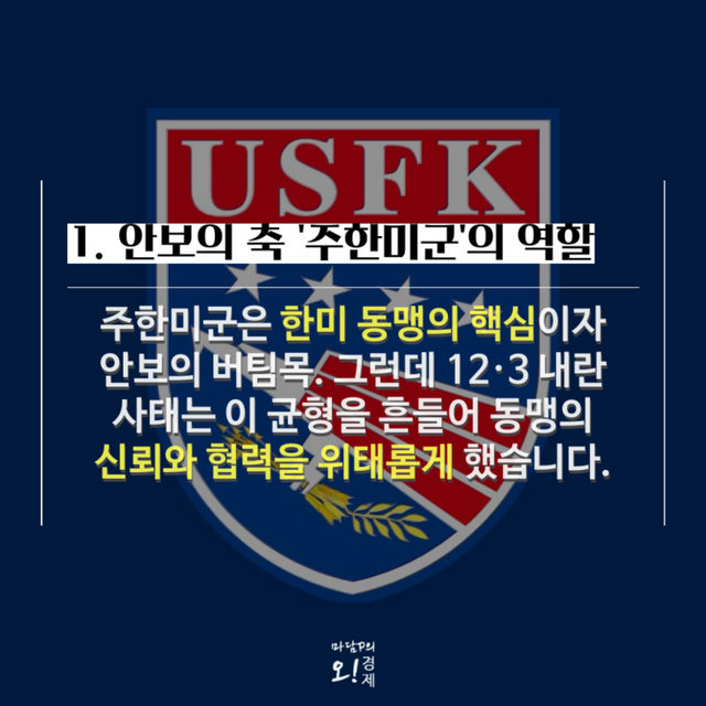 첫째, 대한민국 안보의 축인 '주한미군'의 역할이다. 주한미군은 한미 동맹의 핵심이자 안보의 버팀목. 12·3 내란 사태는 이 균형을 흔들어 동맹의 신뢰와 협력을 위태롭게 했다.