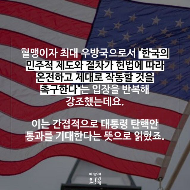 12·3 내란 사태 이후 국제사회, 특히 미국은 민감하게 반응하며 상황을 예의 주시해왔다. 혈맹이자 최대 우방국으로서 "한국의 민주적 제도와 절차가 헌법에 따라 온전하고 제대로 작동할 것을 촉구한다"는 입장을 반복해 강조했던 것으로 미뤄 미국은 간접적으로 탄핵 통과를 기대한 것으로 읽힌다.