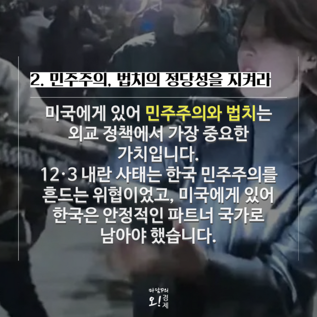 둘째, 미국이 국제 관계에서 민주주의와 법치주의 정당성을 무엇보다 높은 가치로 여긴다는 것이다. 12·3 내란 사태는 한국 민주주의를 흔드는 위협이었고 미국은 한국이 안정적인 민주국가 파트너로 남길 원했다.