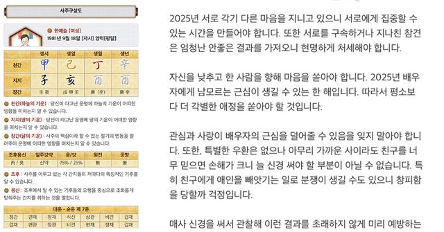 온라인 사주 전문 사이트 '위키사주'에 따르면 한예슬은 내년 배우자에게 남모르는 근심이 생길 수 있다. 따라서 평소보다 더 각별한 애정을 쏟아야 한다. 절대 서로를 구속하지 말아야 하고 안정되게 사랑을 키워 나가야 한다. 2025년에는 자녀운이 좋아 귀한 자녀를 얻는 출산의 운도 들어와 있다. 그 어느 때보다 사랑이 넘치고 부유할 때이기에 서로에게 맞추어준다면 더욱 행복한 한 해가 될 것이다. 유흥을 가까이하면 애정 문제에 반드시 화가 미치게 되므로 조심해야 한다. 서로에게 끊임없이 관심과 노력이 필요하다.