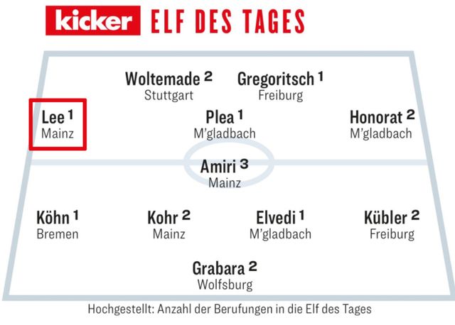 키커 최고 평점을 받은 데다 바이에른 뮌헨에 시즌 첫 패배를 안긴 활약인 만큼 라운드 베스트11 선정이 유력했고, 이변 없이 분데스리가 14라운드를 빛낸 최고의 선수 중 한 명으로 당당히 이름을 올렸다. 마인츠05에서는 미드필더 나딤 아미리와 수비수 도미니크 코어도 함께 선정됐다.