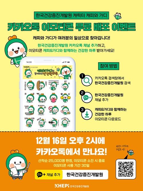 한국건강증진개발원(이하 KHEPI)이 기관 공식 캐릭터 ‘캐피와 가디’의 카카오톡 이모티콘 ‘캐피&가디와 함께하는 건강한 하루’를 오늘(16일)부터 2만5000명에게 무료로 배포한다고 밝혔다.