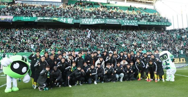 프로축구 전북 현대 선수단이 승리로 경기를 마치고 홈 팬들 앞에서 기념촬영을 하고 있다. / 뉴스1
