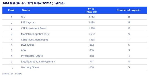 16일 모건스탠리캐피탈 인터내셔널(MSCI), 상업용부동산 서비스회사 컬리어스에 따르면 올해 보유자산 투자금액 기준으로 한국 물류자산을 가장 많이 소유한 해외 투자자는 싱가포르투자청(GIC)이다.
